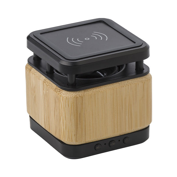 Bocina Bluetooth con batería recargable, cuenta con controles, luces indicadoras y conexión micro USB. La base al estar conectada funciona como cargador inalámbrico de dispositivos con tecnología Qi. Incluye cable USB tipo C