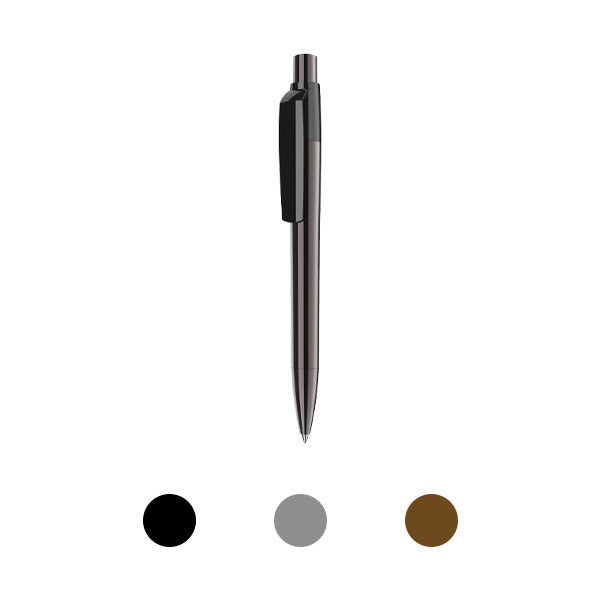 Diseño elegante con cuerpo, punta y pulsador metálicos. El clip en color sólido con acabado brillante aporta un toque moderno y distintivo.