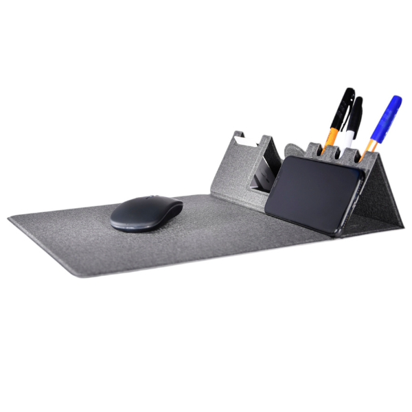 Mouse pad multifuncional con carga inalámbrica: plegable e impermeable, cuenta con soporte para tarjetas y teléfono, bandeja para bolígrafos, interfaz de carga y superficie de precisión para el mouse. Incluye cable tipo C.