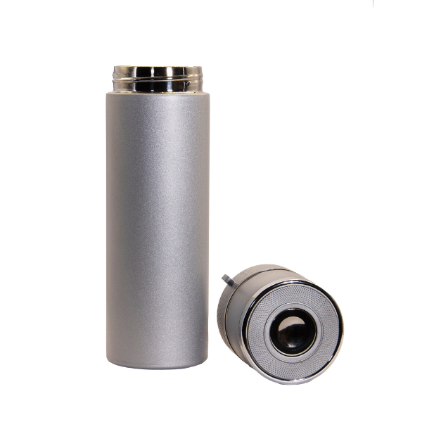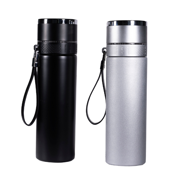Termo fabricado en acero inoxidable de grado alimenticio, con doble pared y aislamiento al vacío. Cuenta con un mecanismo de apertura mediante un botón ubicado en la tapa. Incluye un filtro para te. Cap. 500ml